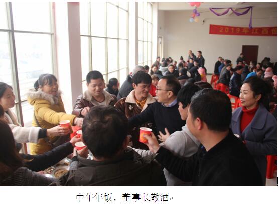 元月31日中午全厂员工欢聚一堂,在公司食堂一起过年,吃年饭。公司为员工准备丰盛的菜肴和酒水,董事长携副总经理每桌敬酒祝福,满满热闹的年味。